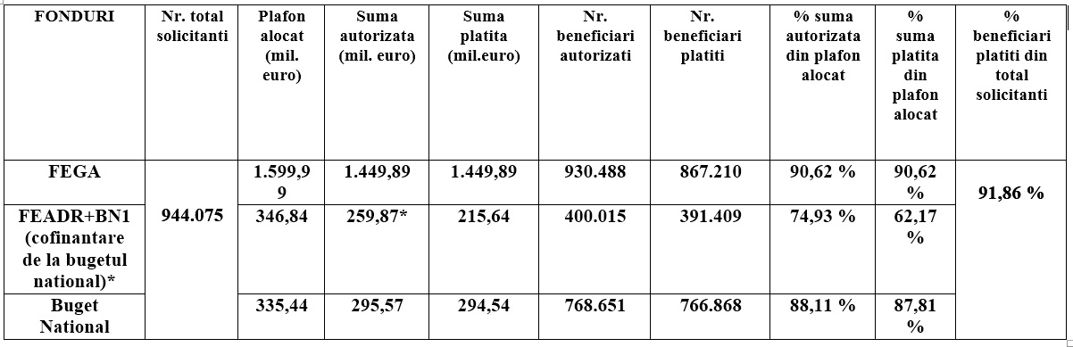 Suma totala autorizata la plata este de 2.005,33 mil. euro din care efectiv platita în conturile fermierilor este suma de 1.960,07 mil. euro, pe toate tipurile de fonduri (Fondul European de Garantare Agricola (FEGA), Fondul European pentru Agricultura si Dezvoltare Rurala (FEADR) si Buget National), conform tabelului de mai jos: