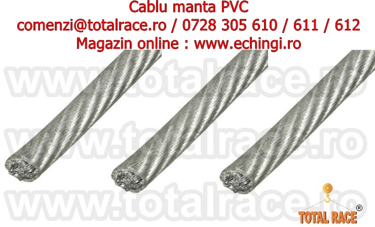 Total Race comercializeaza cu livrare din stoc Bucuresti cabluri manta PVC cu inima metalica , cablu metalic cu protectie PVC productie Olanda , cabluri macarale cu inima metalica, instalatii de ridicat cablu metalic manta PVC , cabluri ridicare manta PVC , cabluri metalice macara, cabluri tractiune constructie 6×7+1PP , cabluri metalice macara cu inima metalica , cablu otel tractiune manta PVC , cablu vamal , sufe tractiune cu manta PVC. Cablul metalic cu manta de PVC si inima metalica poate fi utilizat pentru ancorare , tractiune , suspendare sau cu rol decorativ in domenii diverse. Pentru preturi , date tehnice si stoc accesati magazinul nostru online: www.echingi.ro, www.echingi.com