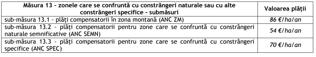 Sumele compensatorii pe care le pot accesa fermieri sunt intre 54 de euro/hectar/an, pentru cei care isi desfasoara activitatea in zone care se confrunta cu costrangeri naturale semnificative (ANC SEMN), si pot ajunge pana la 86 de euro/hectar/an, pentru agricultorii care isi desfasoara activitatea in zonele montane (ANC ZM).