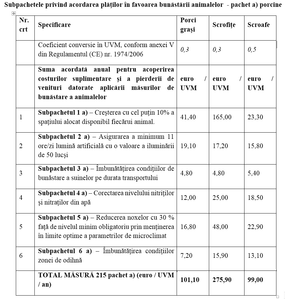 Mai mult decat atat, masura 215, din cadrul PNDR, are ca obiectiv specific asigurarea unor standarde superioare de bunastare a animalelor in cadrul fermelor zootehnice, prin acoperirea costurilor suplimentare si pierderii de venituri pentru imbunatatirea conditiilor de mediu si a bunastarii animalelor, datorate angajamentelor asumate pe baze voluntare in favoarea bunastarii si protectiei prin aplicarea unor masuri, altele decat masurile tehnologice obligatorii, pentru depasirea standardelor minime obligatorii.