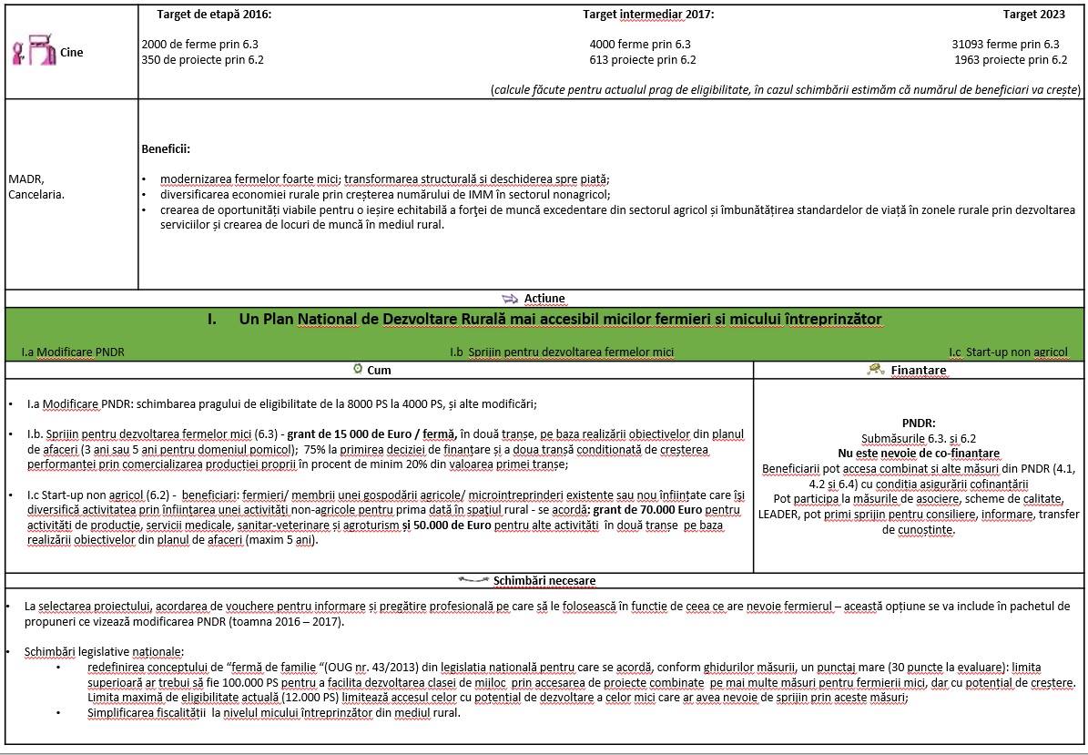 In ceea ce priveste schimbarile necesare, acestea vor include redefinirea conceptului de “ferma de familie “(OUG nr. 43/2013) din legislatia nationala pentru care se acorda, conform ghidurilor masurii, un punctaj mare (30 puncte la evaluare): limita superioara ar trebui sa fie 100.000 PS pentru a facilita dezvoltarea clasei de mijloc prin accesarea de proiecte combinate pe mai multe masuri pentru fermierii mici, dar cu potential de crestere. Limita maxima de eligibilitate actuala (12.000 PS) limiteaza accesul celor cu potential de dezvoltare a celor mici care ar avea nevoie de sprijin prin aceste masuri; Simplificarea fiscalitatii la nivelul micului intreprinzator din mediul rural.