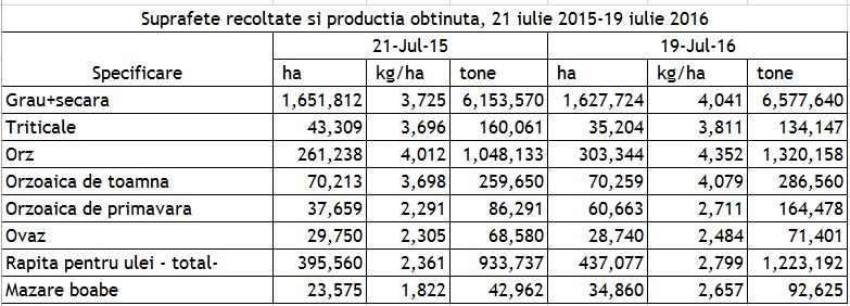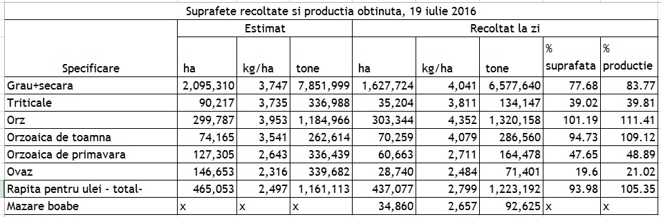 „La cultura de grau, 78%, adica 1.630 mii ha, din suprafata cultivata era recoltata, inregistrand 84%, adica 6.577 mii tone, din productia estimata pentru anul 2016. Fata de perioada corespunzatoare a anului trecut se inregistreaza un randament sporit la hectar, o crestere absoluta de aproximativ 290 kg/ha. Acest fapt ar putea conduce la o recolta de grau care sa depaseasca putin estimarile din primavara”, a declarat, pentru StiriAgricole.ro, Daniel Botanoiu, secretar de stat in cadrul Ministerului Agriculturii.
