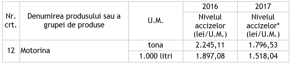 Prin Codul Fiscal, aprobat prin Legea nr. 227/2015 s-a prevazut un nivel diferentiat al ratei standard a accizei la motorina pentru anul 2016, respectiv anul 2017 asa cum este stabilit in Anexa 1 la Titlul VIII, respectiv: