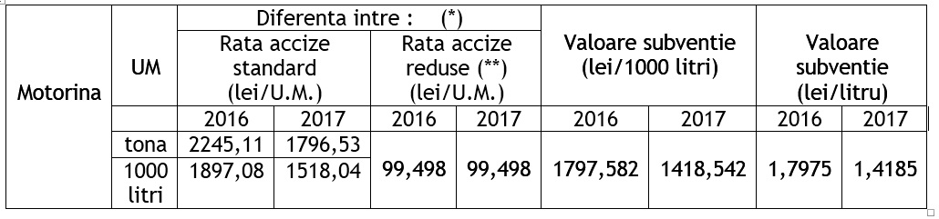 Dupa cum se poate constata, rata standard a accizei pentru anul 2017 de 1518,04 lei/1000 litri, este cu 20% mai mica fata de anul 2016. Intrucat rata redusa a accizei a ramas aceeasi, respectiv de 99,498 lei/1000 litri (calculata dupa formula 21 euro/1000 x 4,7380 lei = 99,498 lei/1000 litri, potrivit prevederilor Directivei 96/2003/CE), diferenta dintre rata standard si rata redusa este mai mica in 2017 decat in 2016. Ca atare, si valoarea nominala a subventiei va scadea de la 1,7975 lei/litru motorina la 1,4185/litru motorina.