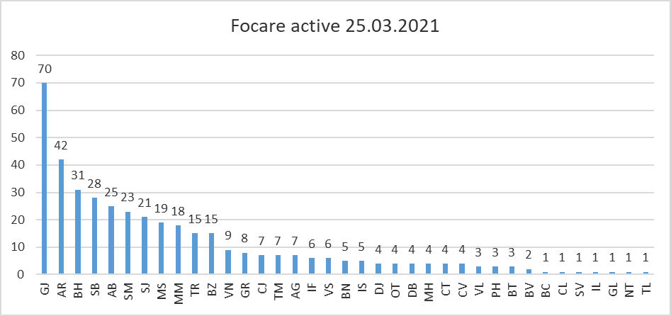 In data de 25.03.2021 sunt active un numar de 407 focare PPA, conform datelor prezentate in graficul nr. 1, din care 7 focare in exploatatii comerciale si 6 focare in exploatatii comerciale de tip A, fiind afectate un numar de 104.408 porcine (animale afectate din focarele active).