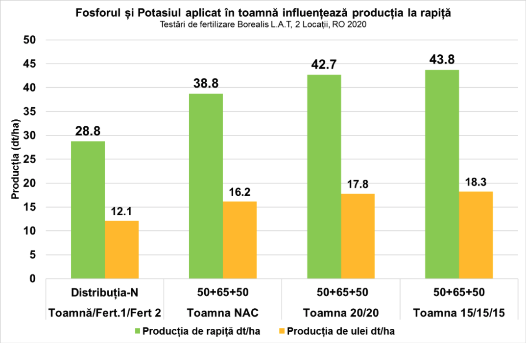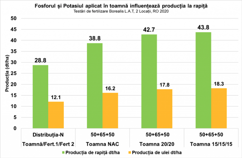 Grafic: Rezultatul testelor de fertilizare la rapita Borealis L.A.T, 2020, media rezultatelor din 2 locatii, RO.