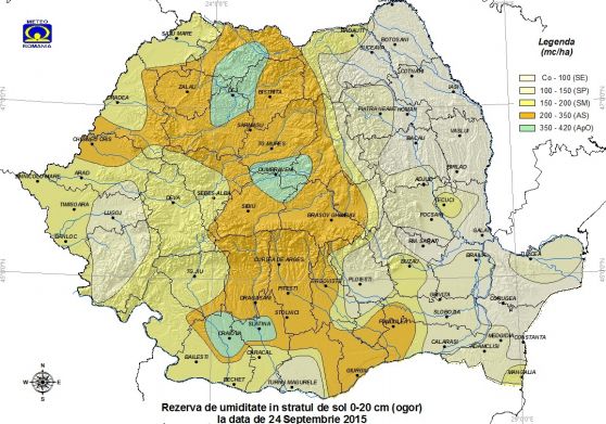La data de 24 septembrie 2015, continutul de umiditate in stratul de sol 0-20 cm / ogor, inregistreaza valori scazute si deosebit de scazute, seceta pedologica fiind moderata (SM), puternica (SP) si extrema (SE), in Dobrogea, Moldova, Maramures, Banat, vestul si sudul Olteniei, sudul si nord-vestul Crisanei, sud-vestul Transilvaniei, estul, nordul, centrul si local in sud-vestul Munteniei. Pe suprafete agricole extinse din Transilvania, estul si centrul Olteniei, vestul, nord-vestul si sudul Munteniei, local in vestul Crisanei, aprovizionarea cu apa a solului se incadreaza in limite satisfacatoare (AS) pana la apropiate de optim.