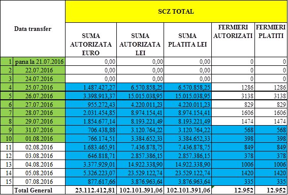 Potrivit situatiei prezentate de fermierul Costel Caras, pe pagina sa personala de Facebook, suma autorizata la plata pentru Sprijinul Cuplat Zootehnic, pana la data 07.08.2016, este de 102.101.391 lei, aceasta fiind si suma platita. Fermierii autorizati la plata sunt in numar de 12.952, conform aceleasi surse.