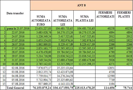 Pentru ANT 8, suma autorizata la plata este de 336.417.550 lei, suma platita fiind de 225.013.478 lei, conform situatiei publicate de fermierul Costel Caras. Pana la data 07.08.2016, pentru ANT 8 au fost autorizati la plata 114.656 de fermieri, dintre acestia fiind platiti 75.744.