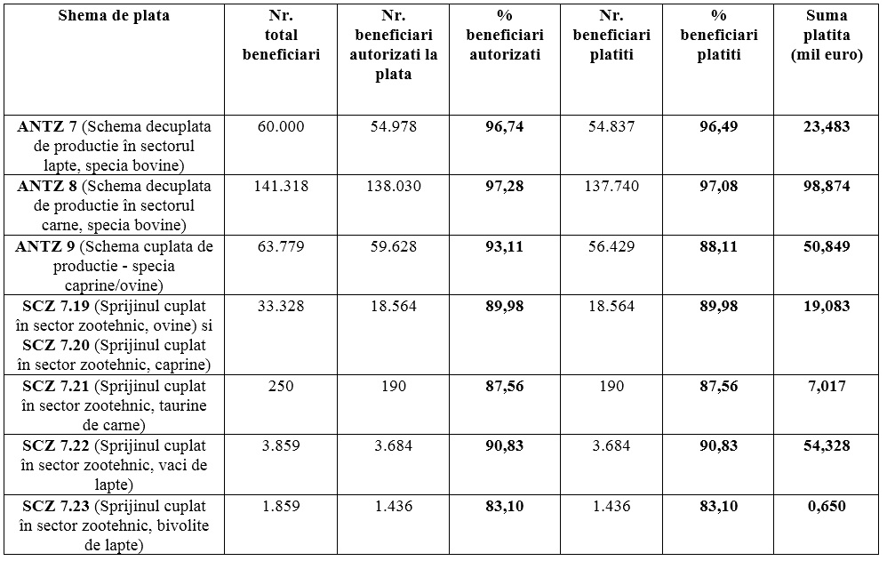 Conform informatiilor APIA, in cadrul schemei ANTZ 7 (Schema decuplata de productie in sectorul lapte, specia bovine) au fost platiti pana acum 54.837 de fermieri, suma platita fiind 23,48 de milioane de euro.